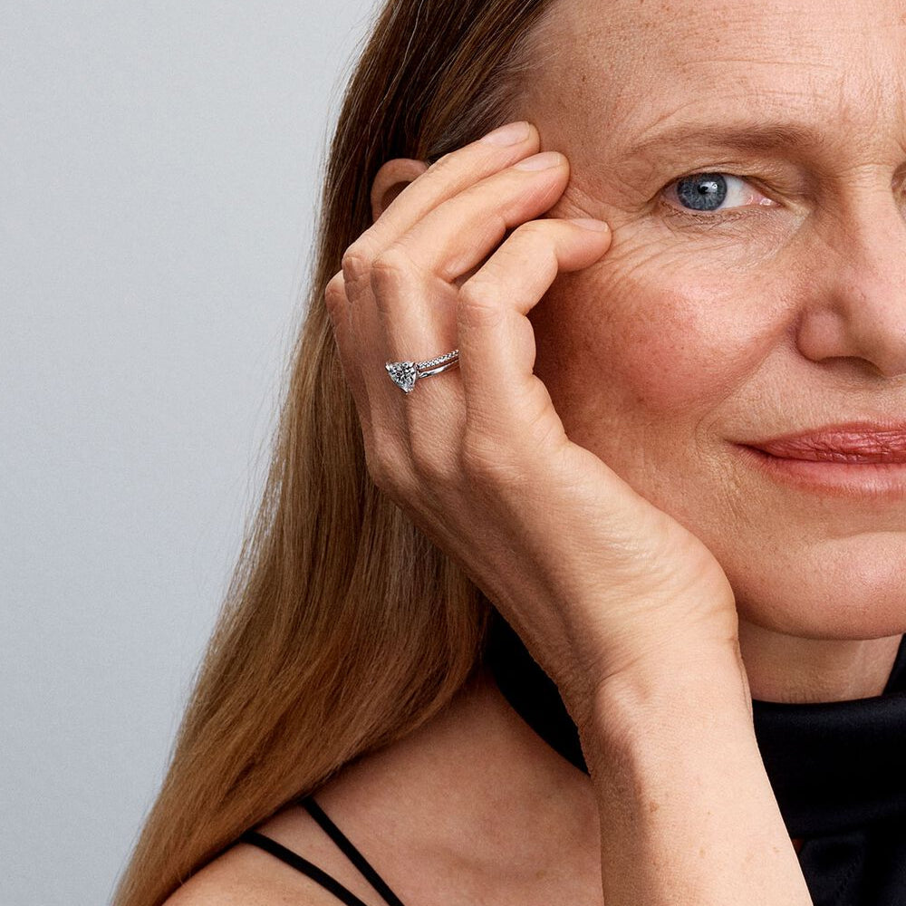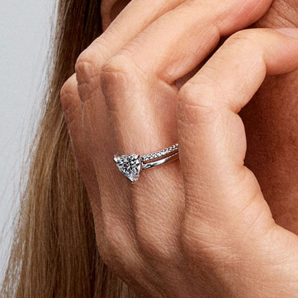 A symbol of love and radiance, this Pandora heart-shaped ring is crafted in sterling silver and adorned with sparkling cubic zirconia. The double-heart inspired design blends timeless romance with modern elegance, making it perfect for proposals, anniversaries, or simply celebrating love. Its delicate pavé accents highlight the brilliance of the centerpiece, creating a ring that shines from every angle.