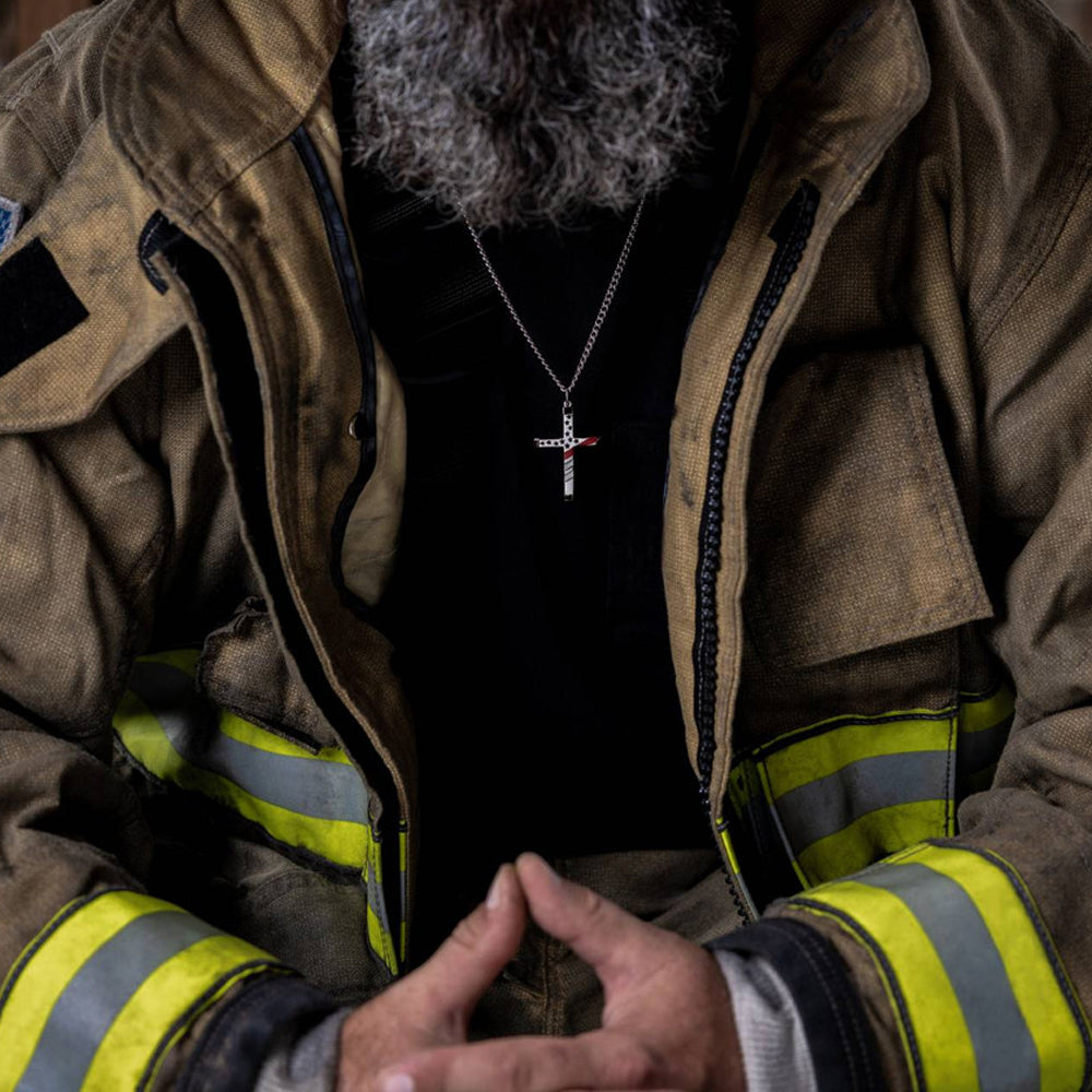 This men’s tapered cross necklace is a powerful reminder of Jesus’ ultimate sacrifice, inscribed with His words from John 19:30: “It is finished.” The front of the cross is designed with patriotic stars and stripes, highlighted by a bold thin red line symbolizing courage, sacrifice, and protection—often representing firefighters, paramedics, and first responders. With its strong yet meaningful design, this cross serves as both a declaration of faith and a tribute to those who stand between danger and safety. A statement piece for any man who loves Jesus and carries His strength daily.